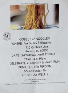 OODLES of NOODLES Posted on January 15, 2023January 15, 2023 by Scott Holland Calendar Add to Calendar Add to Timely Calendar Add to Google Add to Outlook Add to Apple Calendar Add to other calendar Export to XML When: April 1, 2023 @ 4:00 pm – 6:30 pm2023-04-01T16:00:00-05:002023-04-01T18:30:00-05:00Where: Fox Valley FellowshipClub 710 Orchard Ave Aurora, IL 60506 USACost: $10 / Kids under 16yrs $5